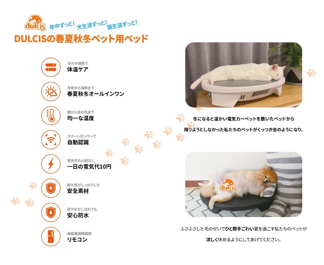 「dulcisペット用ベッド」は,24℃から40℃の間、1℃間隔で温度を細かく制御でき,ペット用にカスタマイズされた体温ケアスペースを提… |